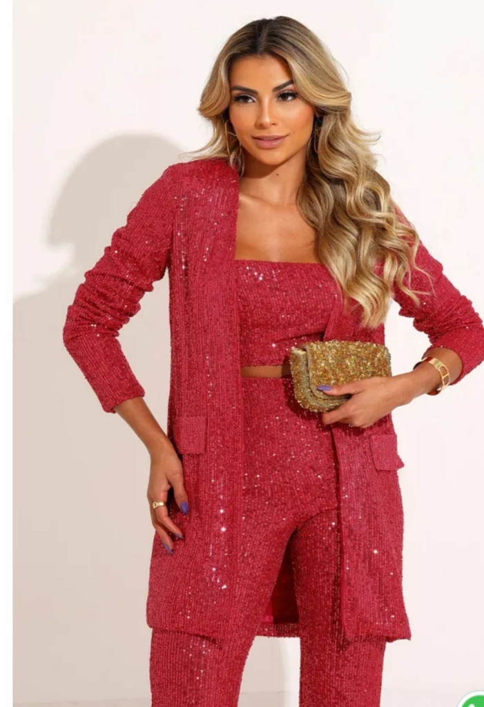 Confeccionado com uma camada interna em tecido de cetim, proporciona um conforto excepcional para o uso prolongado. Além disso, o blazer é todo coberto por delicados paetês, tornando-se a escolha perfeita para quem ama um look cheio de charme e luminosidade.